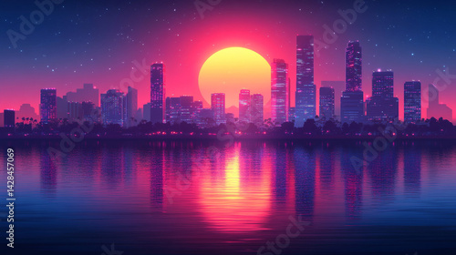 © Brian, Fototapeta premium Retro cityscape at sunset, vibrant colors reflecting on calm water.