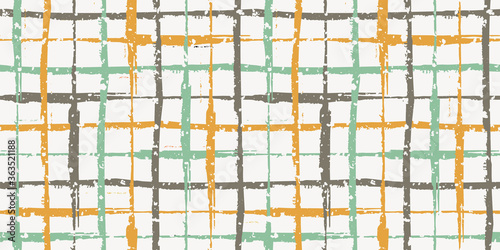 © Gaianami Design, Fototapeta premium Retro color grunge line vector seamless grid border with flecked snowflake texture. Hand drawn brush stroke style linear plaid banner. Abstract irregular geometric mesh design with weave effect