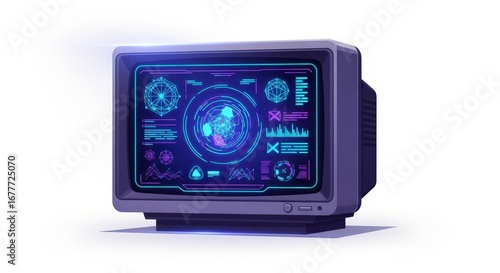 © Manji, Fototapeta premium Retro Computer Monitor Displaying Glowing Blue Futuristic Data Interface on White Background