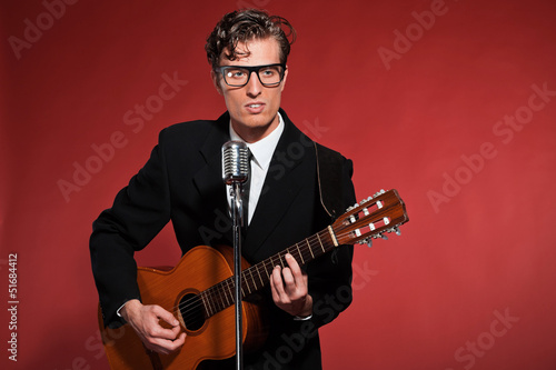 Obraz premium Retro fifties musician with glasses playing acoustic guitar. Stu