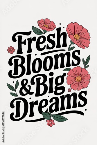 © AstutiStudio, Obraz premium Retro Floral Typography: Fresh Blooms and Big Dreams on White Ba