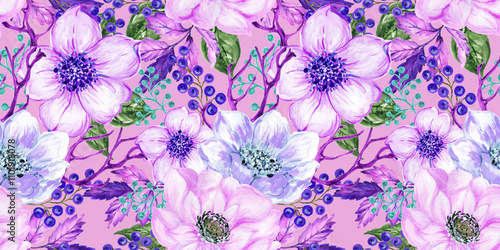 © HoyaBouquet, Obraz premium Retro flower blossom festive traditional pattern garland noel jolly holly Christmas trees and gifts.