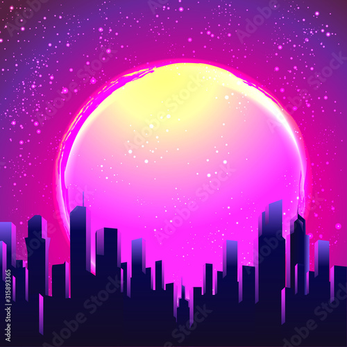 © vgorbash, Fototapeta premium Retro Futurism. Vector futuristic synth wave illustration. 80s Retro poster Background with Night City Skyline. Rave party Flyer design template in 1980s style.