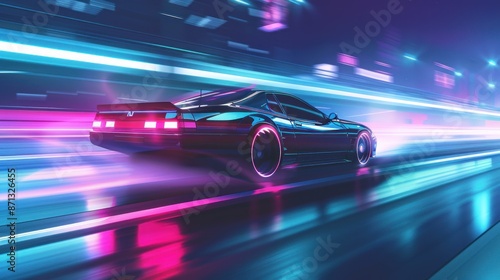Obraz premium Retro Futuristic Car Racing Through Neon City