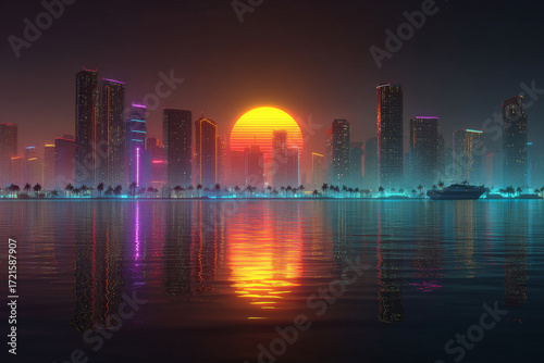 © chatchawan, Fototapeta premium Retro futuristic neon city skyline with synthwave colors reflecting on water, featuring vibrant sunset