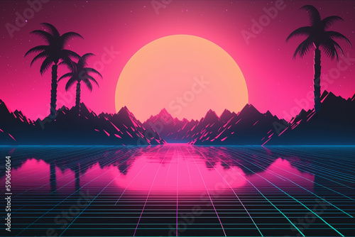 © Hassan, Naklejka premium Retro Futuristic neon gaming landscape background