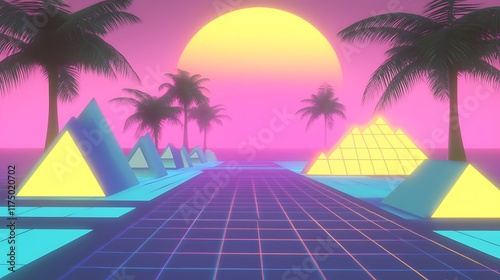 Naklejka premium Retro Futuristic Palm Tree Pyramid Sunset Landscape