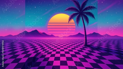 Naklejka premium Retro futuristic sunset landscape illustration.