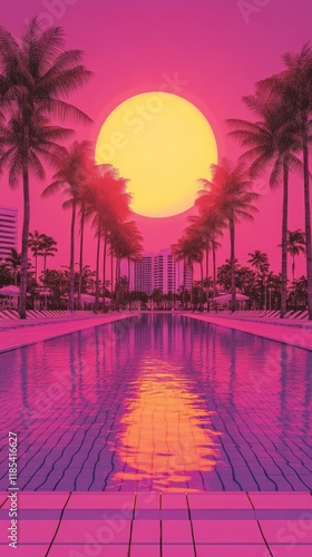 © Artajar, Fototapeta premium Retro-futuristic Sunset Over a Tropical Canal with Palm Trees
