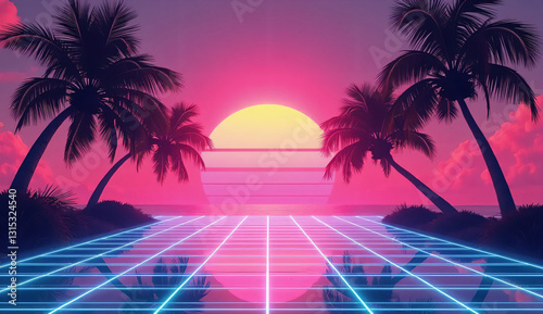 Naklejka premium Retro-Futuristic Sunset with Neon Grid and Palm Trees
