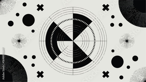 Obraz premium Retro Geometric Composition in Black and White with Concentric Circles Radiating Lines and Simple Shapes creating an abstract artistic background for creative projects