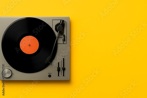 © Christopher, Obraz premium Retro Gray Turntable with Orange Label Vinyl on Bright Yellow Background - Classic Analog Music Player - Vibrant Design Element and Copy Space