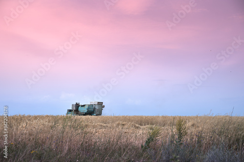 Naklejka premium Retro harvester working in the field against the background of the sunset purple sky. Harvest, landscape of the countryside. Concept of agriculture and natural beauty.