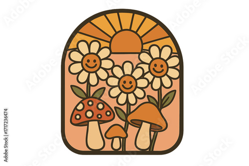 © Vuyen, Fototapeta premium Retro hippie badge with cute groovy daisy flowers, sunbeam and mushrooms. Trendy hand drawn vector graphic in 70s style. Psychedelic floral cartoon for peace and love.