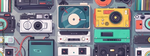 Obraz premium Retro-inspired illustrations of technology gadgets such as cameras, cassette tapes, or vinyl records.