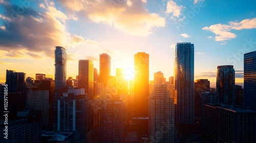 Fototapeta premium Retro-inspired skyscrapers pierce the morning clouds, their foundations...