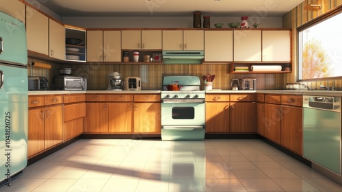 Fototapeta premium Retro Kitchen Interior with Green Appliances and Sunlight Streaming in