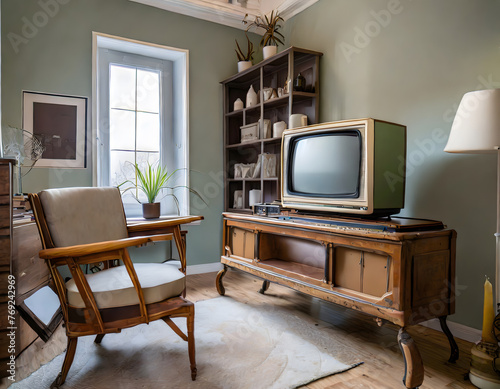 Fototapeta premium Retro living room design with old television cabinet and radio along with...