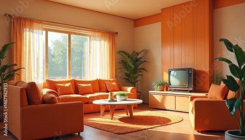 © Pete, Fototapeta premium Retro living room interior in 1970s-1980s style. Orange couch armchair, retro TV, round table. Home decor with plants and retro style. Room designed in mid-century modern style.