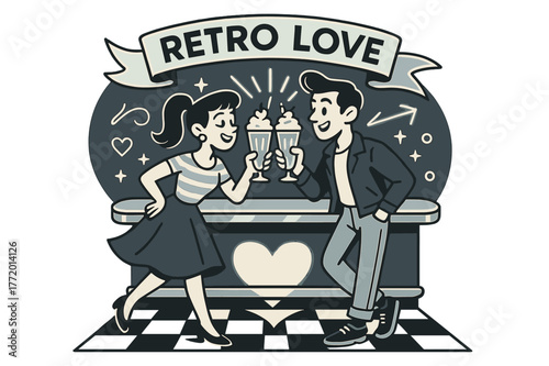 Obraz premium Retro Milkshake Romance. Retro couple. A stylish pair clink milkshakes under neon glow; ?Retro love? loops on a ribbon above a chrome counter. Their shadows