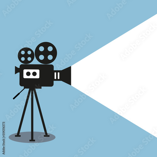 © elena3567, Obraz premium Retro movie projector poster. Video camera on a tripod on a gray background