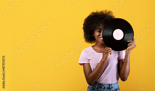 © Prostock-studio, Fototapeta premium Retro music concept. Excited african american lady holding vinyl record and smiling on yellow background, panorama