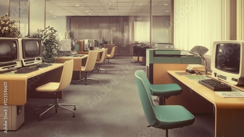 Fototapeta premium Retro office interior with vintage computers, desks, and chairs.