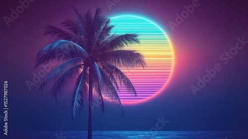© Matoya, Fototapeta premium Retro Palm Tree Neon Sunset Beach Scene