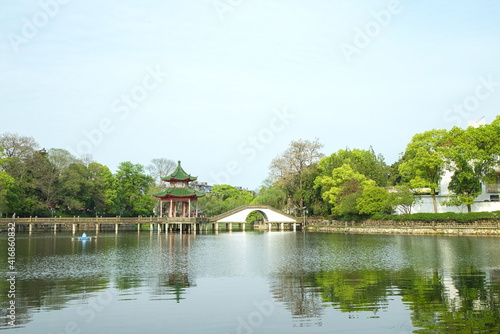 Fototapeta premium Retro pavilion and stone arch bridge on the lake in the park, traditional Chinese garden landscape