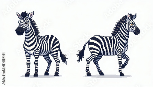 Obraz premium Retro pixelated 8-bit zebra, front-facing and side profile galloping, isolated on a white background, vintage game-inspired design.