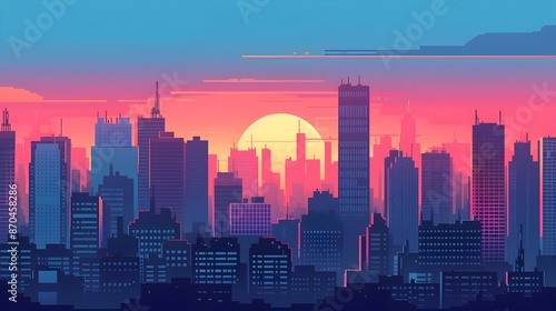 © yelosole, Fototapeta premium Retro Pixelated Skyscraper Cityscape at Dramatic Sunset Skyline