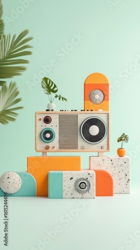 © milenialdesastudio, Obraz premium Retro radio with plants and colorful blocks