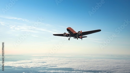 Fototapeta premium Retro Red Airplane Flying Above Cloudscape