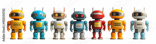 Fototapeta premium Retro Robot Collection, A Row of Vintage Bots Standing Together in a Colorful Display