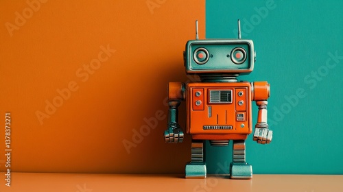 © ACE STEEL D, Fototapeta premium Retro Robot on a Two-Tone Background Vintage Artificial Intelligence Concept