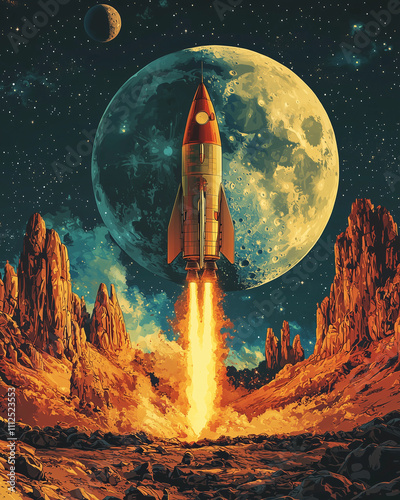 Obraz premium retro rocket launches against a celestial backdrop with a giant moon,...