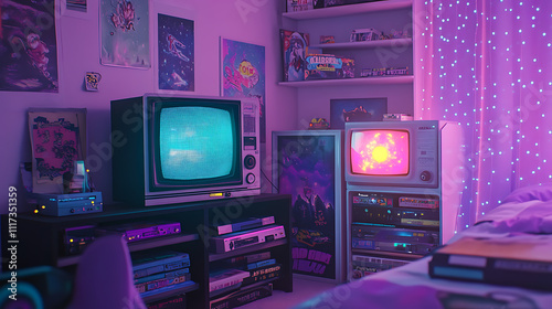 Obraz premium Retro room with vintage televisions and neon decor creates a nostalgic...