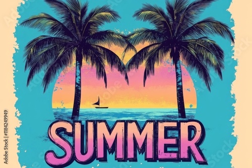 © Sukon, Naklejka premium Retro 80s aesthetic showcasing summer vibes with pastel colors.