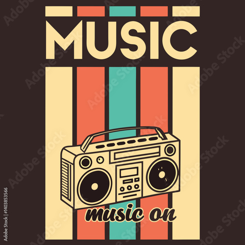 Obraz premium Retro 80s Boombox Music Vintage Graphic Art Poster Beige Orange Teal Stripes T-Shirts and Wall Art Prints