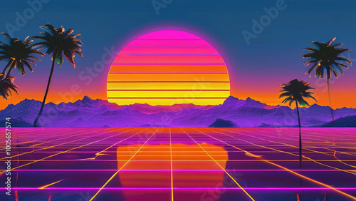© edisetiawan.id, Naklejka premium Retro 80s Synthwave Sunset