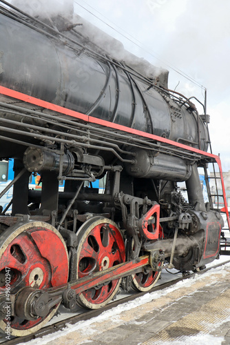 © Sergei Timofeev, Naklejka premium retro steam lococmotive in the winter on the station