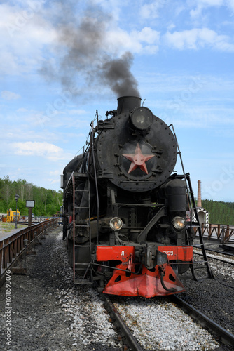 © Sergey, Fototapeta premium Retro steam locomotive of the mid-20th century with a smoking pipe in Karelia