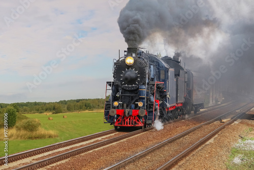 © Sergey, Obraz premium Retro Steam Locomotive Traveling Along Railroad Along Rural Fields