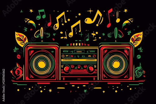 Fototapeta premium Retro stereo music design with vibrant colors and musical notes.