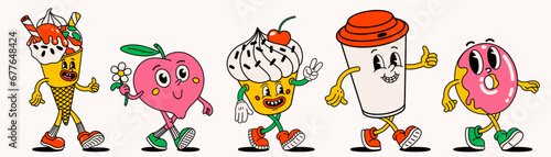 Fototapeta premium Retro style Funny cartoon food. Groovy vintage 70s coffee cup, donut, ice cream cone, peach and cupcake characters with cute faces walking.