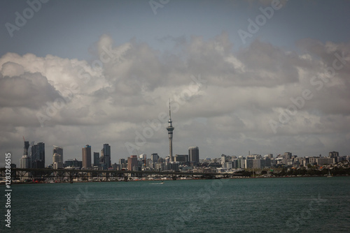 © Irina B, Naklejka premium Retro style photo of a view over Auckland Harbour and a skyline of Auckland City from a suburb of Birkinhead. North Island, New Zealand