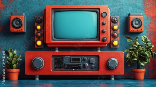 Fototapeta premium Retro-styled home entertainment system with orange components and plants