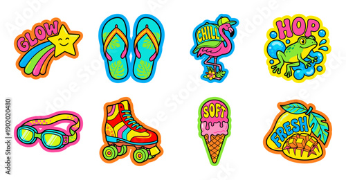 © PixeloAI, Naklejka premium Retro Summer Sticker Set with Colorful Vector Illustrations