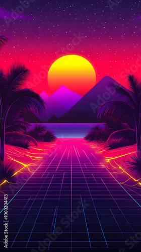 Fototapeta premium Retro sunset landscape with a glowing grid path.