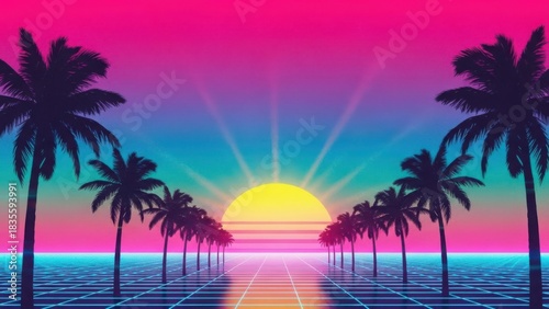 © mdtuhin, Naklejka premium Retro sunset landscape with palm tree silhouettes and glowing neon grid